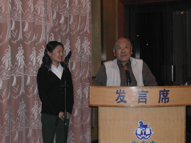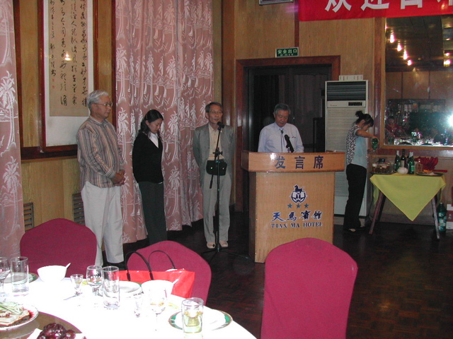 | シルクロード沙漠緑化を歓迎する天馬賓館での晩餐会の垂幕 | 草炭研究会中西理事の司会で開催された | 北海道の高橋ピートモス会長の挨拶 | 最後は李林業場長とボランティア笹さんの中国語と日本語での「北国の春」合唱で大いに盛り上がった |
