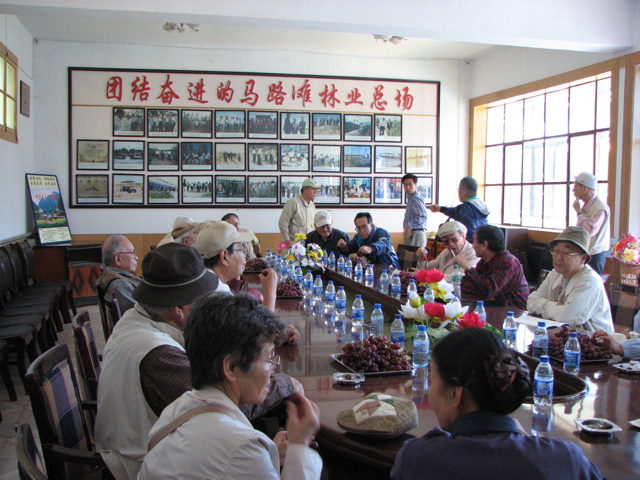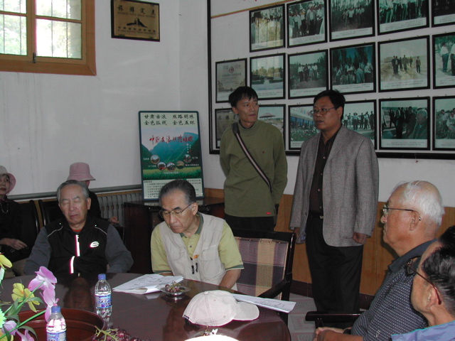 | 武威市から馬路灘林業場へ バスで約1時間 | 林業場では垂幕を作って一行を歓迎してくれました | 李林業場長の歓迎挨拶を受けました | 林業場で収穫した葡萄のご馳走になりました |