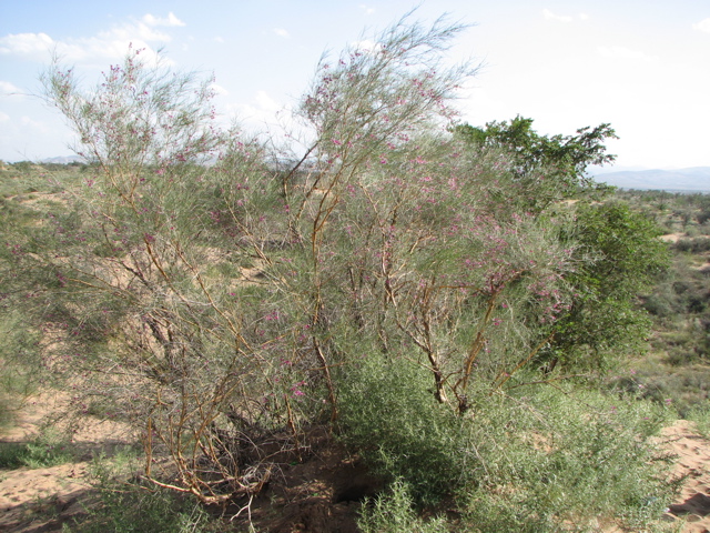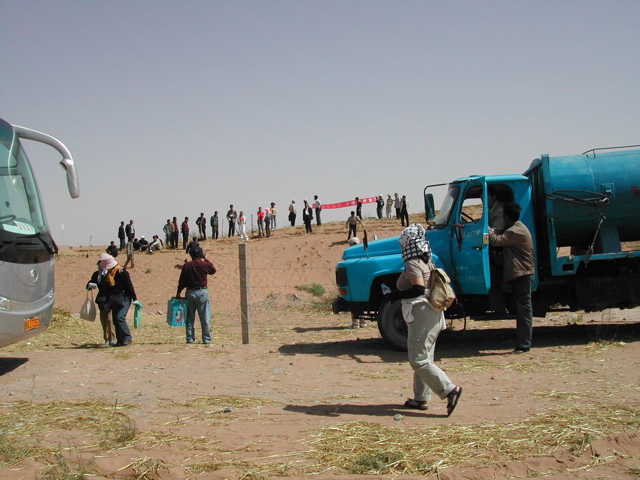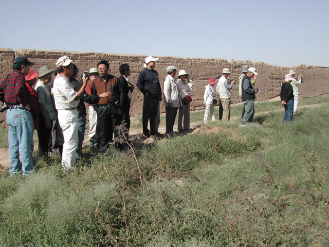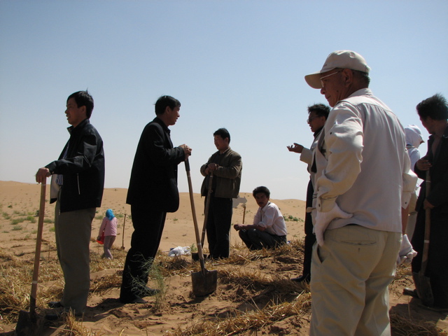 昨年の植樹地も見た。約85%の苗が活着して、中には小さな赤い花を付けている花棒もあった。今年植えた苗が育った姿を見に、将来再び訪れたいと強く思った。植樹を終わって武威市へ帰る途中、6人の地元民が25年かけてが植樹した八歩沙緑地を見た。砂嵐が下校中の子供を襲ったのが緑化のきっかけだと言う。花棒の木が大きく育っていた。