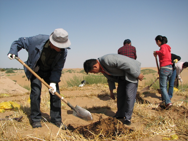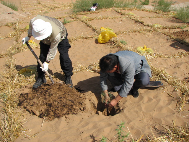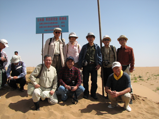 植樹地へ向うバスの中で沙漠緑化の基礎知識を草炭研究会の佐伯理事から説明を受け、また現地では林業場の方から植え方を教えてもらい、皆慣れぬ作業ながら思い出に残る体験をしました。今回植えたのは、花棒で乾燥や寒さ暑さに強く、成長すると小さな赤い花をつけ、来年が楽しみです。2m間隔で作られた草方格の中に、湿潤処理をした草炭と砂を1:2で混合した用土を使用して苗木を植えました。