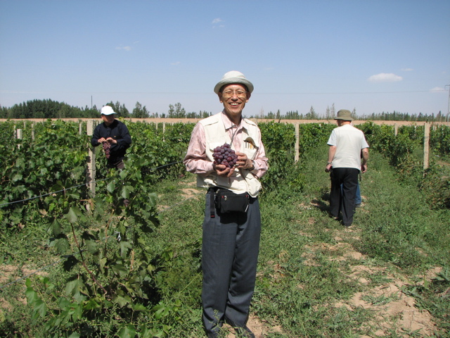 植樹後は林業所内のゲストハウスで食事をした。塩ゆでした羊肉や、ローストポテト旅行中の最も記憶に残る美味だった。午後は林業場の育苗値を見学した。植樹した花棒の苗はここで育てられていた。葡萄畑も見た。ご馳走になったおいしい葡萄はここで採れたものである。