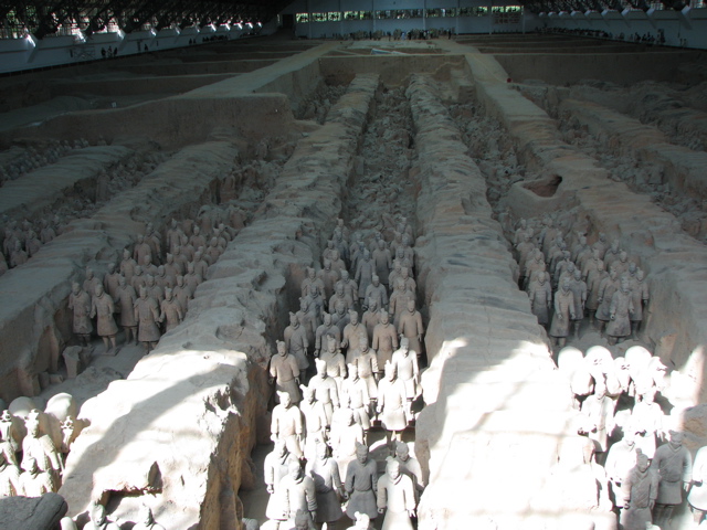 兵馬俑坑が果樹園で井戸を掘っていた農民によって発見されたのは1974年、今から30数年前のこと。精巧な人馬の像が並ぶ地下の大部隊は、2200年前、秦の始皇帝の陵墓を守る形で埋められたもので、まるで今にも動き出しそうな迫力。