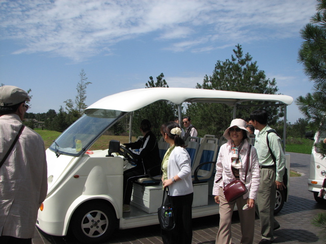 | 兵馬俑坑博物館の前で、グループで大勢参加したT-1会(大学同窓生)の皆さん | 2号坑から見つかった青銅製の銅車馬 | 駐車場から博物館までは電動カートで | 兵馬俑坑遠望、駐車場付近から |