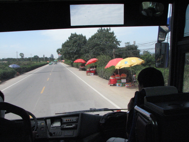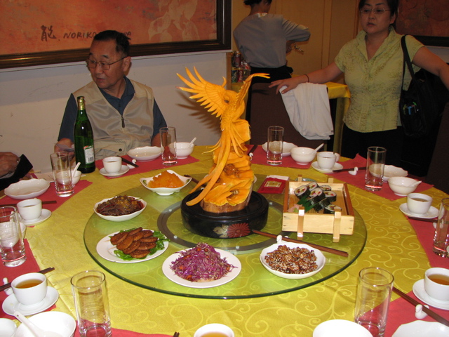 | 昼食は慈恩寺近くの精進料理屋。 | 料理は総て豆腐と野菜。後ろの女性はガイドの後藤さん | 夕食のテーブルで、四川風の本格的中華料理。 | 兵馬俑坑博物館近くでみた道端のざくろ売り。 |