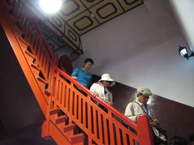 | 慈恩寺の入口で | 高さ64mの塔の最上層へ全員登った。 | 最上層からの西安の眺め | 塔内部の階段 |