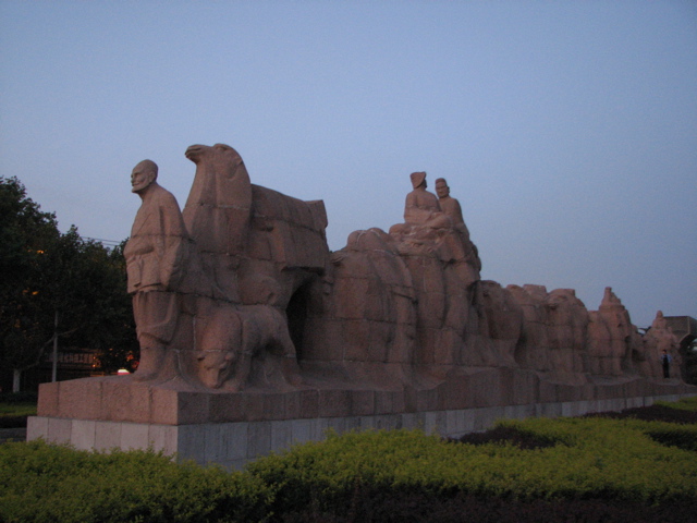 | 明代の規模を残す西の城門 | 周囲12kmの城壁は遊歩道になっている。 | 城門の窓からシルクロードが西へ向って始まるのが見える。 | シルクロードを西に向う隊商の彫刻を見た頃は日も沈んでいた。 |