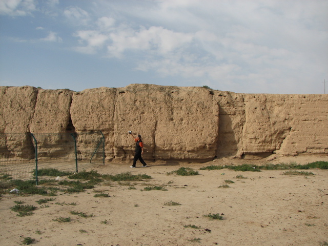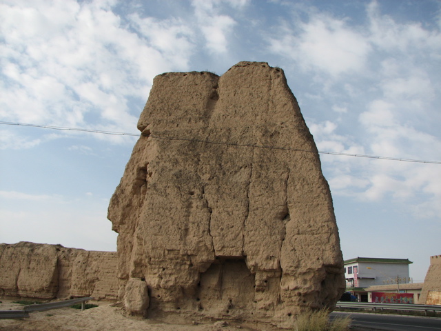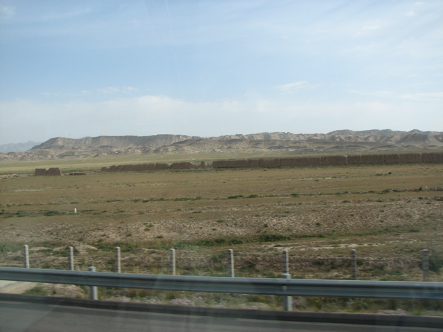 9月12日(火)、武威から嘉峪関まで、バスで500km、8時間の予定で走り、途中張掖に寄った。武威を出ると、道は直ぐにゴビ灘(たん)に入った。ゴビとはモンゴル語で、一木一草生えていない小石混じりの沙漠のことを云います。間もなく、高速道路に入りますが、左右に小石を積み上げたお墓が目につきます。祁連山脈の麓には林もあります。所々に川もありますが、水は山脈から北へ向って流れ、次第に細くなってゴビに消えて行きます。武威を出て1時間半も走った9時頃、バスの右手に、延々と続く長城が見えてきました。長城の高さは9m、所々にのろし台が作ってあり高さは15mあります。明代に作られたものは新しい長城で、古いのは漢代、秦代もあり、ほとんど修復されていなく泥と藁で練り固められて、建設当時のままです。目的は騎馬の侵入を防ぐことでした。高速道路と交差するところで、バスから降りて見学しました。