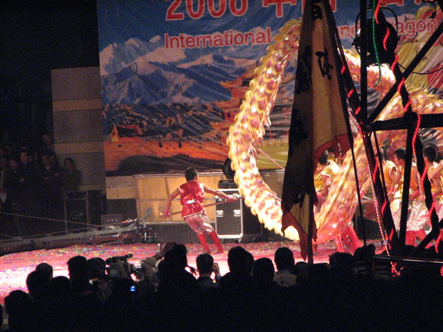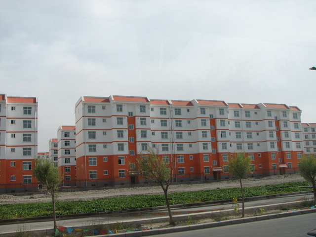 | 沙漠の中にこつ然と現れる高層アパート群。 | アパートの数は想像を超える。 | 獅子舞はお役人を歓迎するためだろうか。 | 竜踊りの迫力もさすが。 |