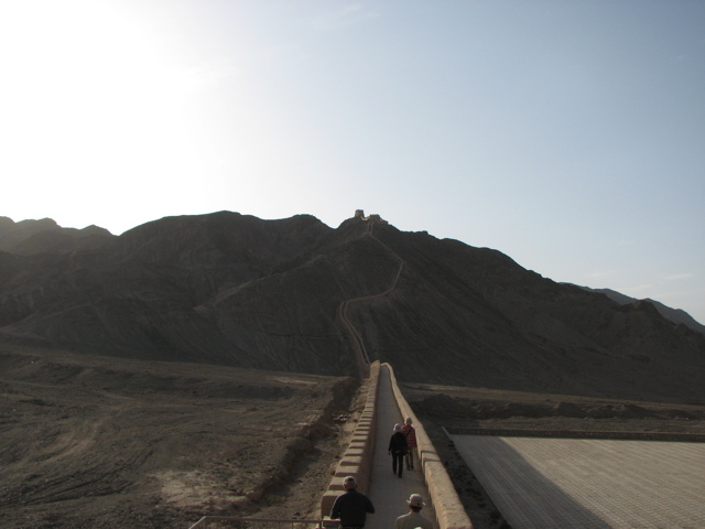 砦からバスで更に進むと険しい山が現れ、その嶺に沿って懸崖長城が作られている。チベット族の侵入を防ぐための見張り台でもあったらしい。長いバスの旅の疲れもあったが、全員、長城を登り、日の傾いたゴビを頂上から眺めた。