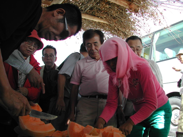 | 楡林窟近くの緑地。国家重点生態公益林の看板がある。 | 紅柳や花棒が大きく成長している。 | 高速道路の道端に哈密瓜の売店が出ている。 | 運転手の陸さんが手際よく瓜を切り開く。 |