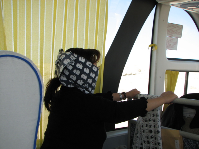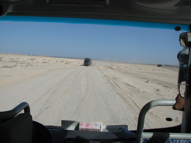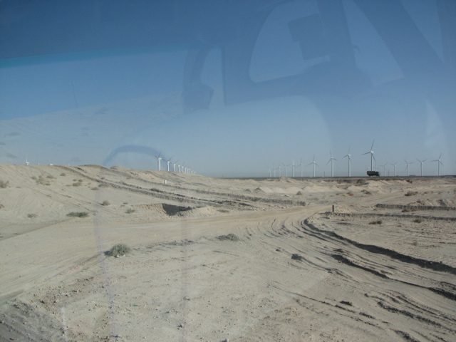 | 工事中の箇所を行くときはバスの揺れは激しい。 | ガイドの後藤さんはスカーフで完全武装。 | 風の底は今では風力発電のメッカ。 | 延々と続く風力発電機。 |
