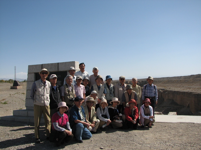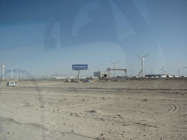 9月13日(水)、今日も約400kmのバス旅行。嘉峪関を出て約2時間。相変わらずのゴビ灘だが、道の南北に山が迫ってくる。頂上に雪をいただいた祁連山と馬しゅう山に挟まれた盆地のゴビに北東のシベリアから冷たい空気が猛烈な勢いで流れ込む。風の底と言われたこの地帯は今では風力発電に向いた立地として利用され、甘粛省酒泉安西風力発電所(100MW)が一部稼働している。
