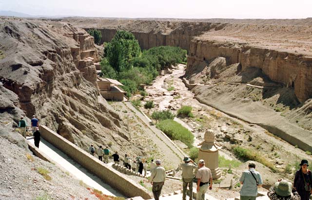 安西を出て南に向うと、道は山道に入る。一面に小さなこぶ状の山が続き、草木は無い。楡林窟は安西から70kmのところにある。楡林河の両岸の断崖に掘られた石窟で、東壁に32窟、西壁に11窟と敦煌莫高l窟と比べれば規模は小さいが、北魏(5世紀)の時代から元にかけて作られた壁画は色彩も鮮やかで芸術性も高いと言われる。