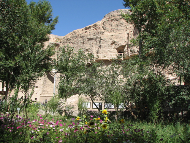 | 楡林河の岸辺に楡の木が茂る。 | 断崖に沿って長い回廊が作られ、その奥に蜂の巣状に洞窟が掘られている。 | ひまわりやコスモスが咲き誇る楡林窟。 | 全員で記念写真。 |